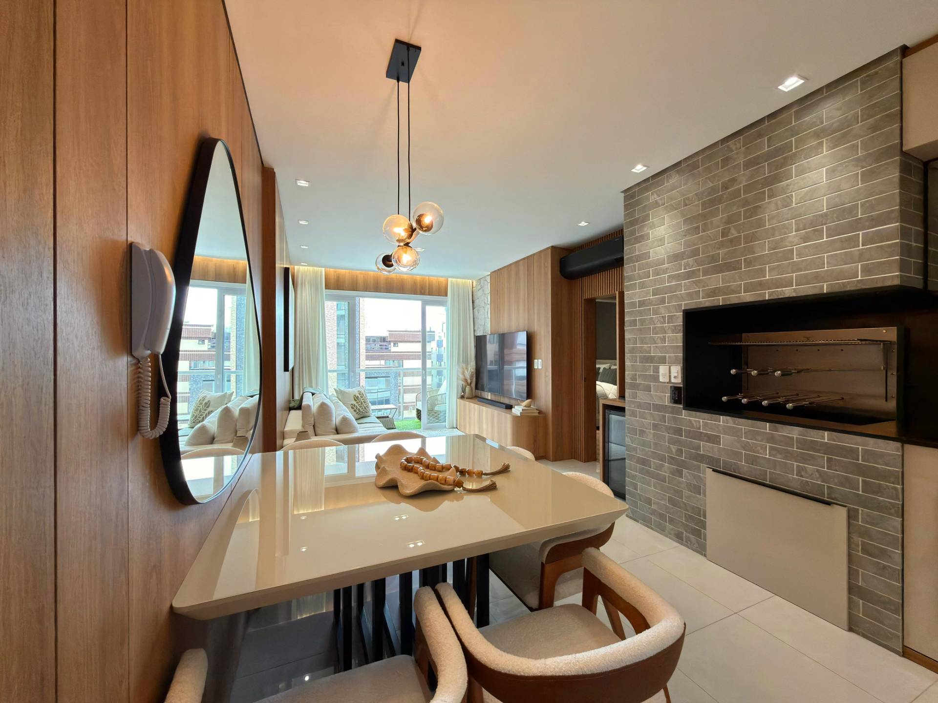 LUXUOSO E IMPONENTE. Magnífico apartamento finamente mobiliado e decorado, com móveis sob medida, revestimento em painel de madeira, mármores, porcelanato em padrão classe AA, living 2 ambientes, sacada de frente, cozinha americana, área de serviço, agua quente e gás central, split, teto com rebaixo em gesso, vaga de garagem. Localizado a poucas quadras da praia, próximo a praça Flávio Boianoviski. Edifício alto padrão, feito por uma das construtoras mais renomadas da cidade, esquadrias em PVC, 2 elevadores, portaria eletrônica, infraestrutura completa. Agende agora mesmo sua visita